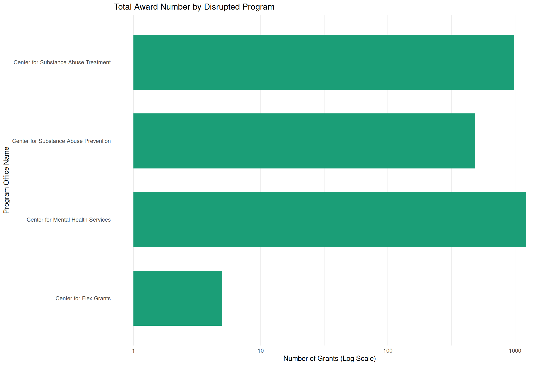 Still the grants that were targeted from these latter two programs, the Center for Mental Health Services and Center for Substance Abuse, represent the largest amount in disrupted funding compared to the other two program offices on January 13th.