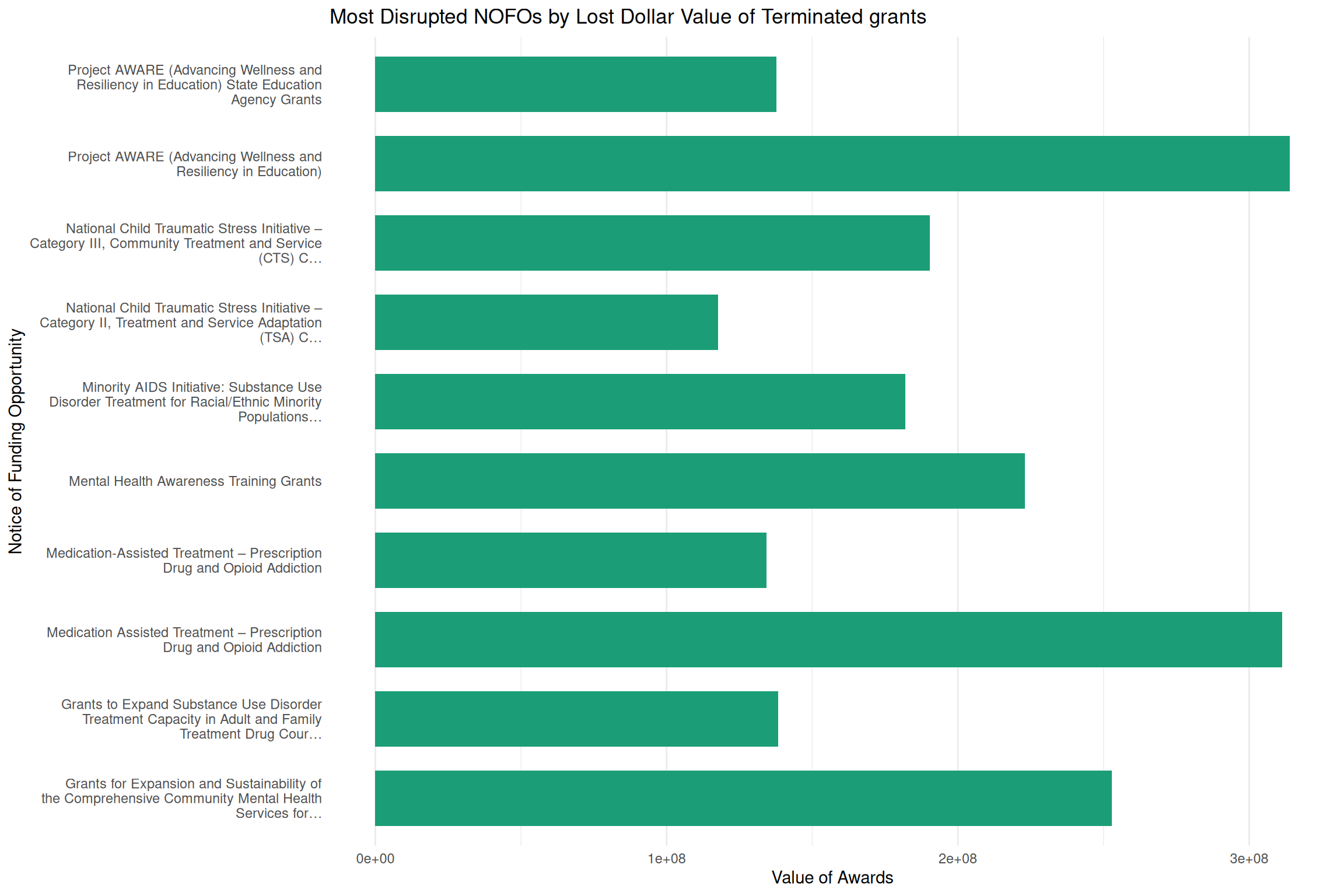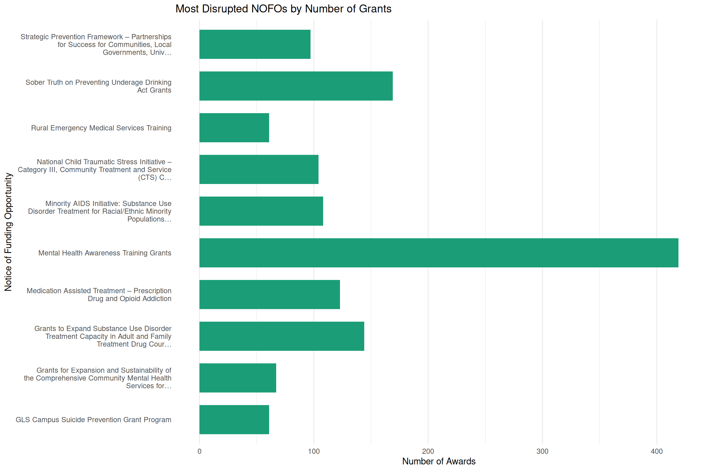 Finally, when looking at the Notice of Funding Opportunities (NOFOs) for the grants that were disrupted on January 13th, we see that the NOFOs with the most disrupted grants include those that focused on the following topics among others: