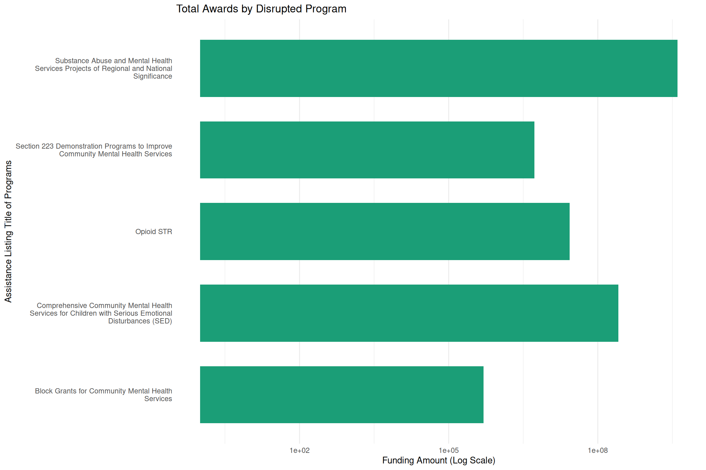 In a previous update, we shared the launch of a new tracker to provide details on every grant that received a termination letter by SAMHSA (the Substance Abuse and Mental Health Services Administration) on January 13th, 2026. This included 2,700 separate mental health programs worth $2 billion in funds across all 50 states. As we previously noted, these programs span a spectrum of activities, including state-based initiatives for traumatized youth and their families to Mental Health Centers of Excellence at HBCUs.