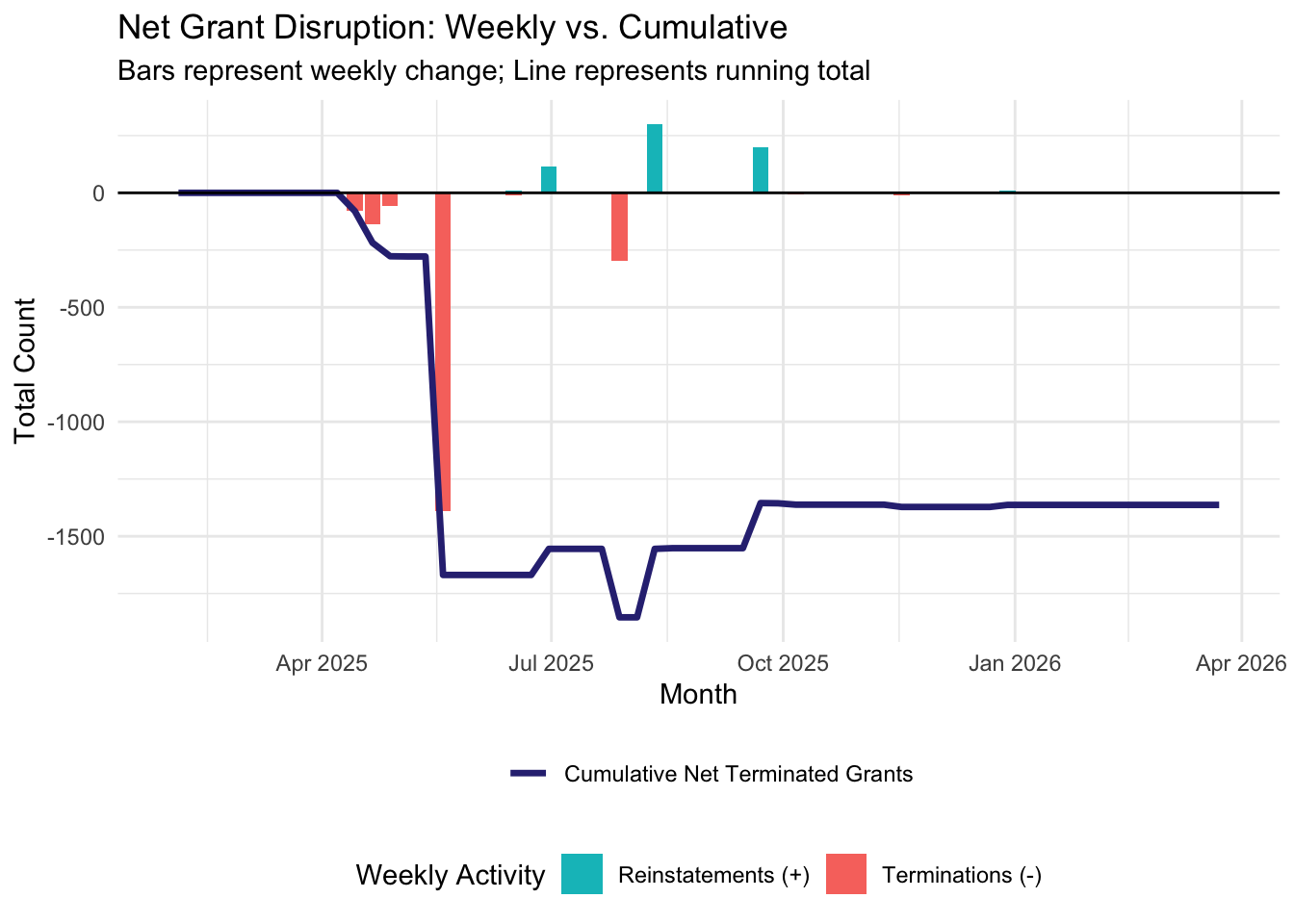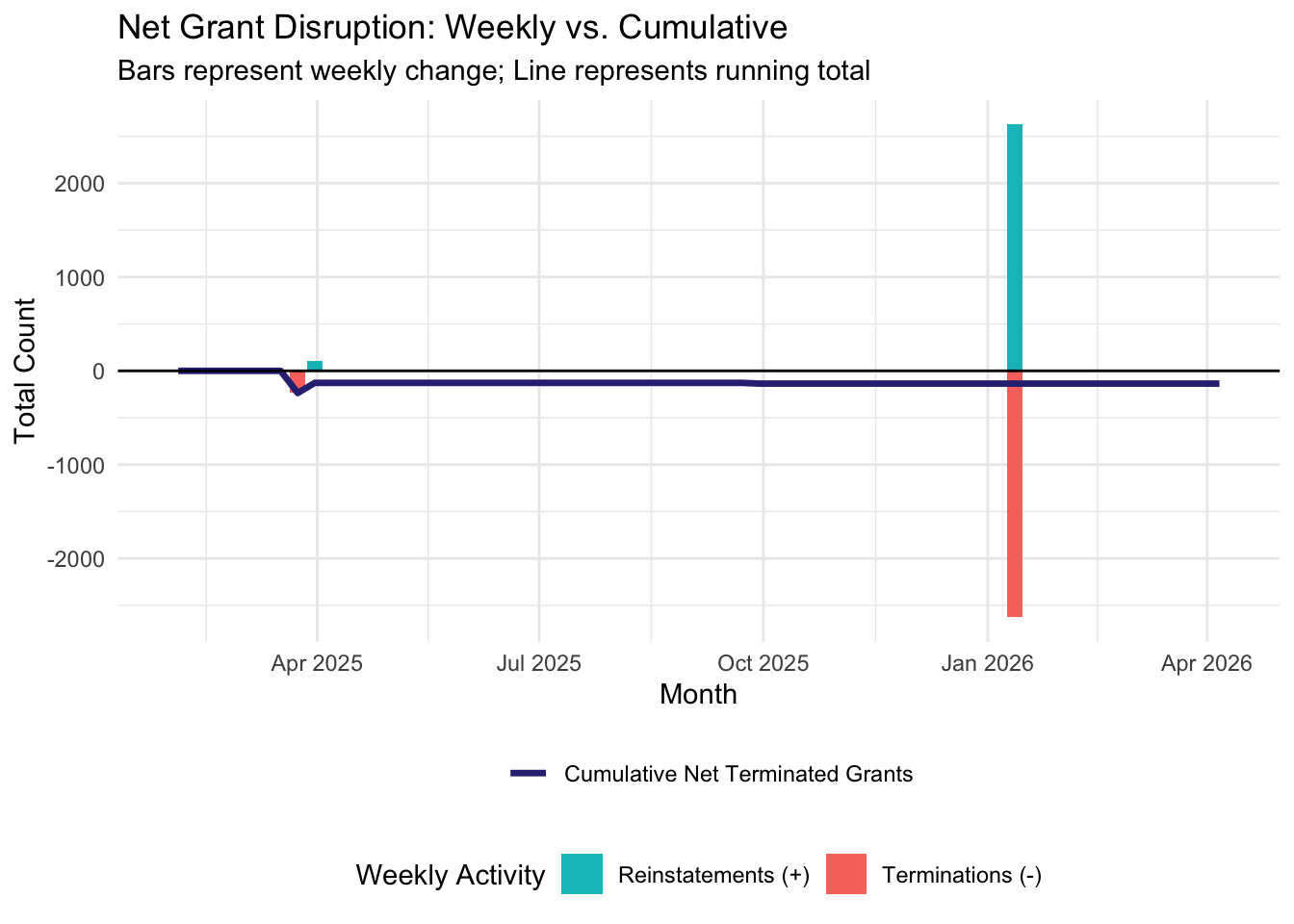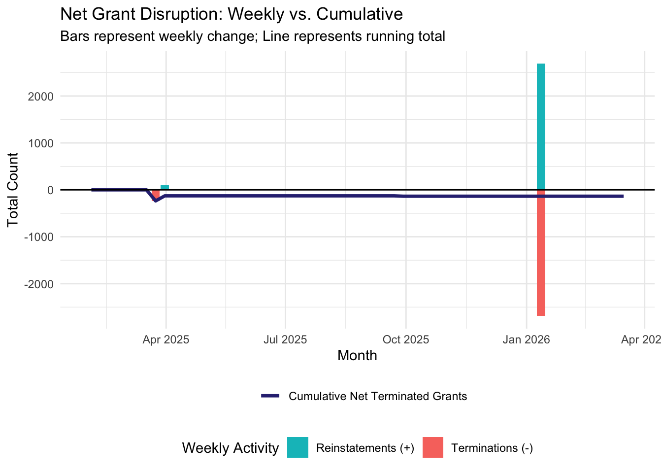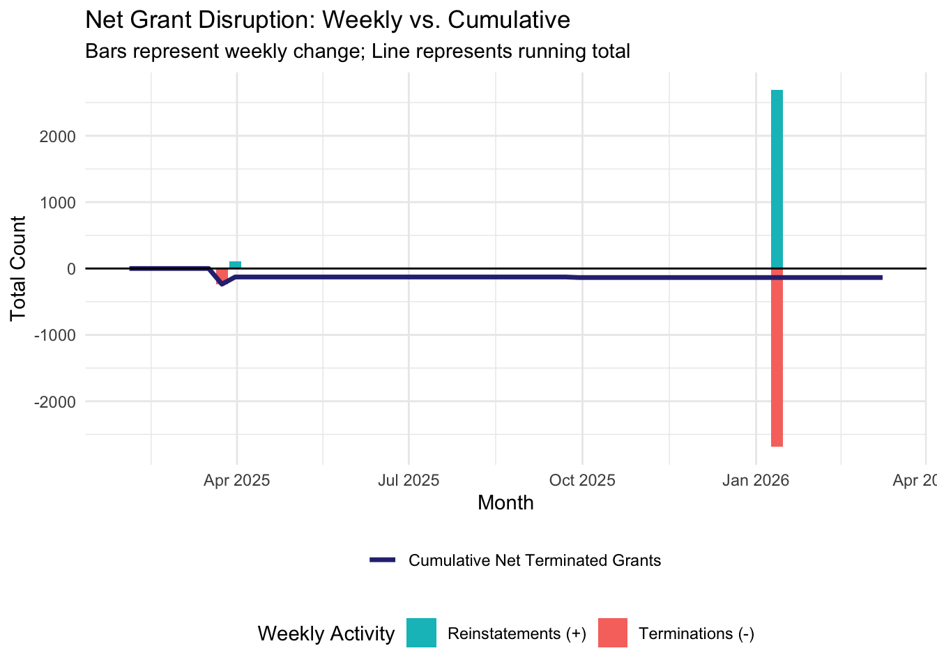 Starting the week of February 2nd, 2026, we will be publishing weekly reports that summarize and analyze the most recent grant disruptions, starting with a summary of what happened in 2025 and into the first month of 2026. If you would like to review a certain week’s report, navigate to the relevant post below.