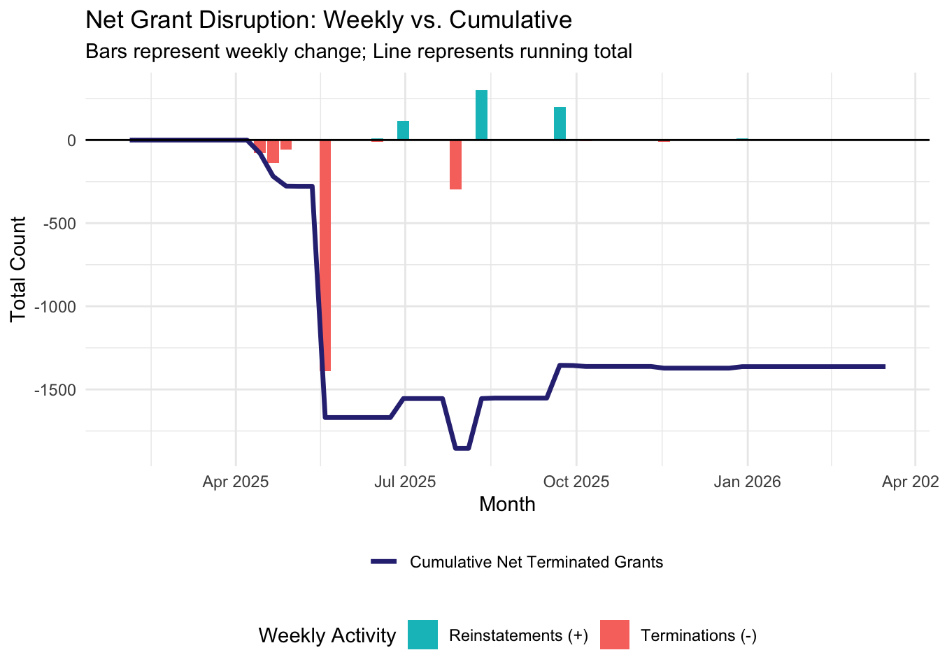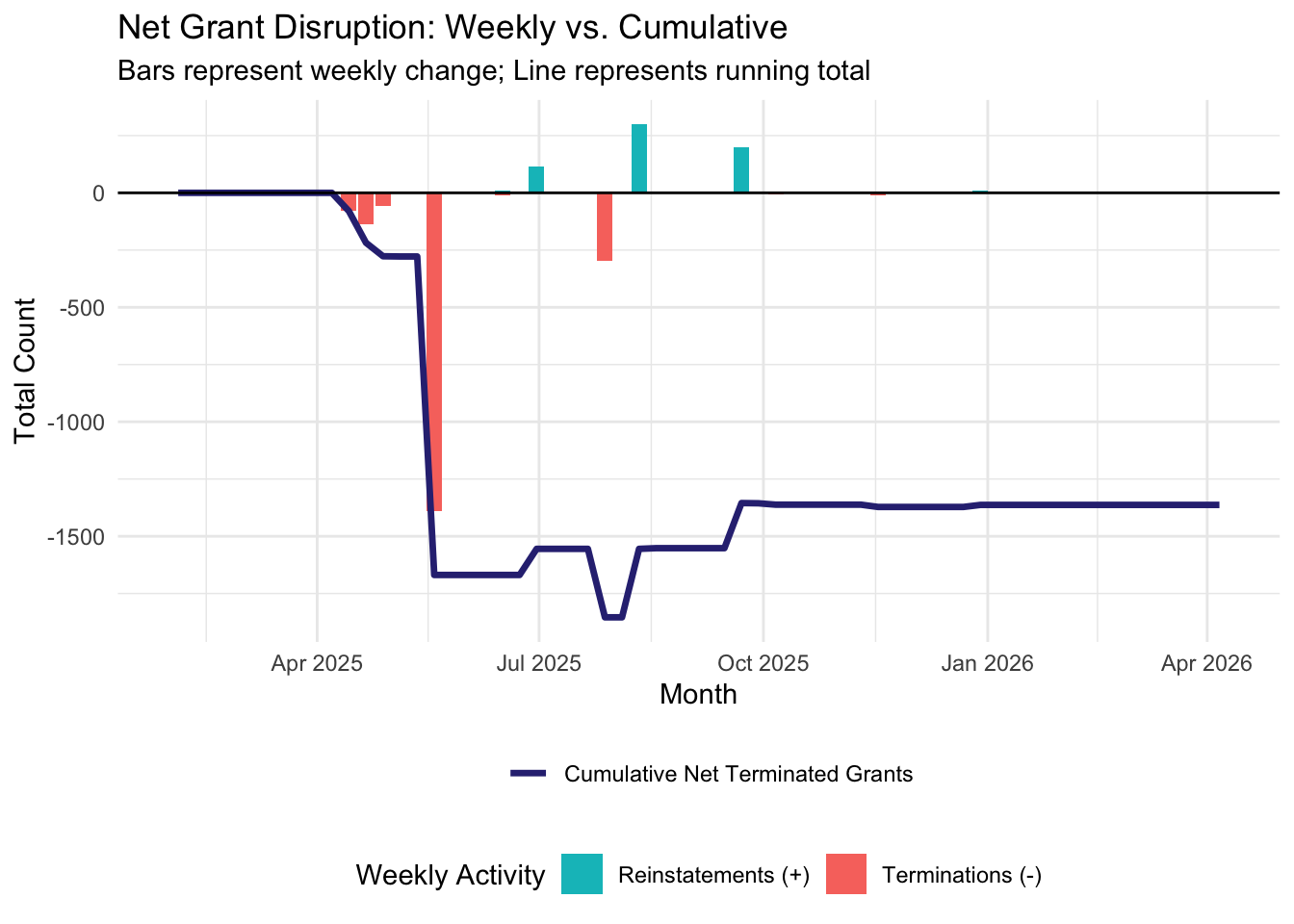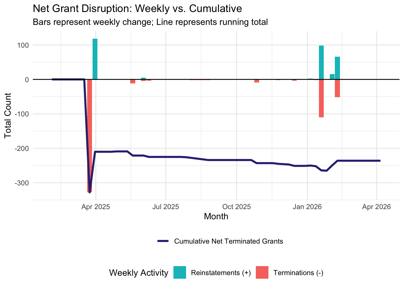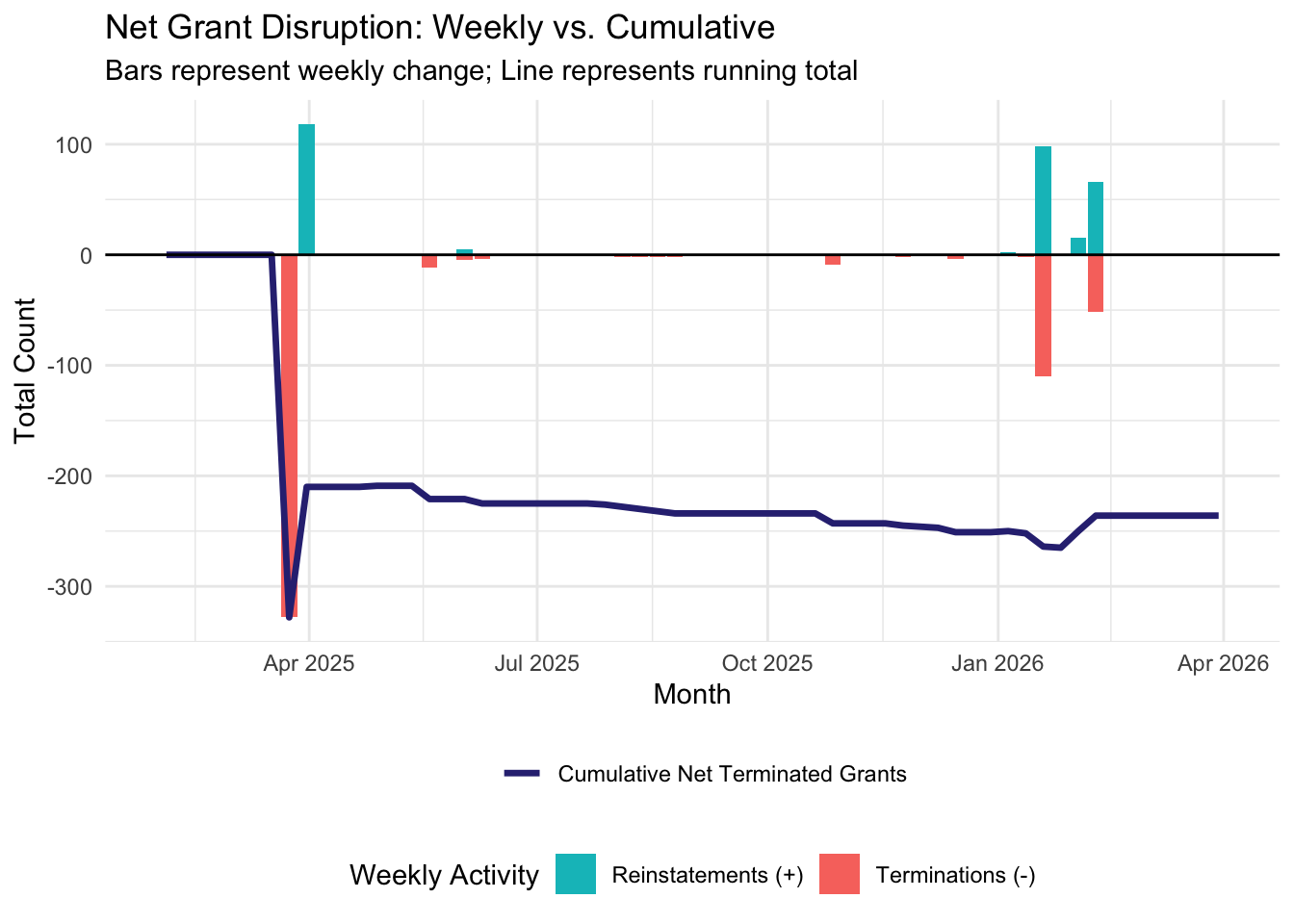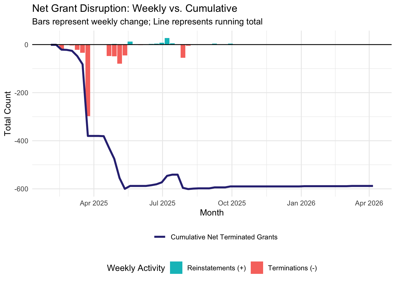 Starting the week of February 2nd, 2026, we will be publishing weekly reports that summarize and analyze the most recent grant disruptions, starting with a summary of what happened in 2025 and into the first month of 2026. If you would like to review a certain week’s report, navigate to the relevant post below.