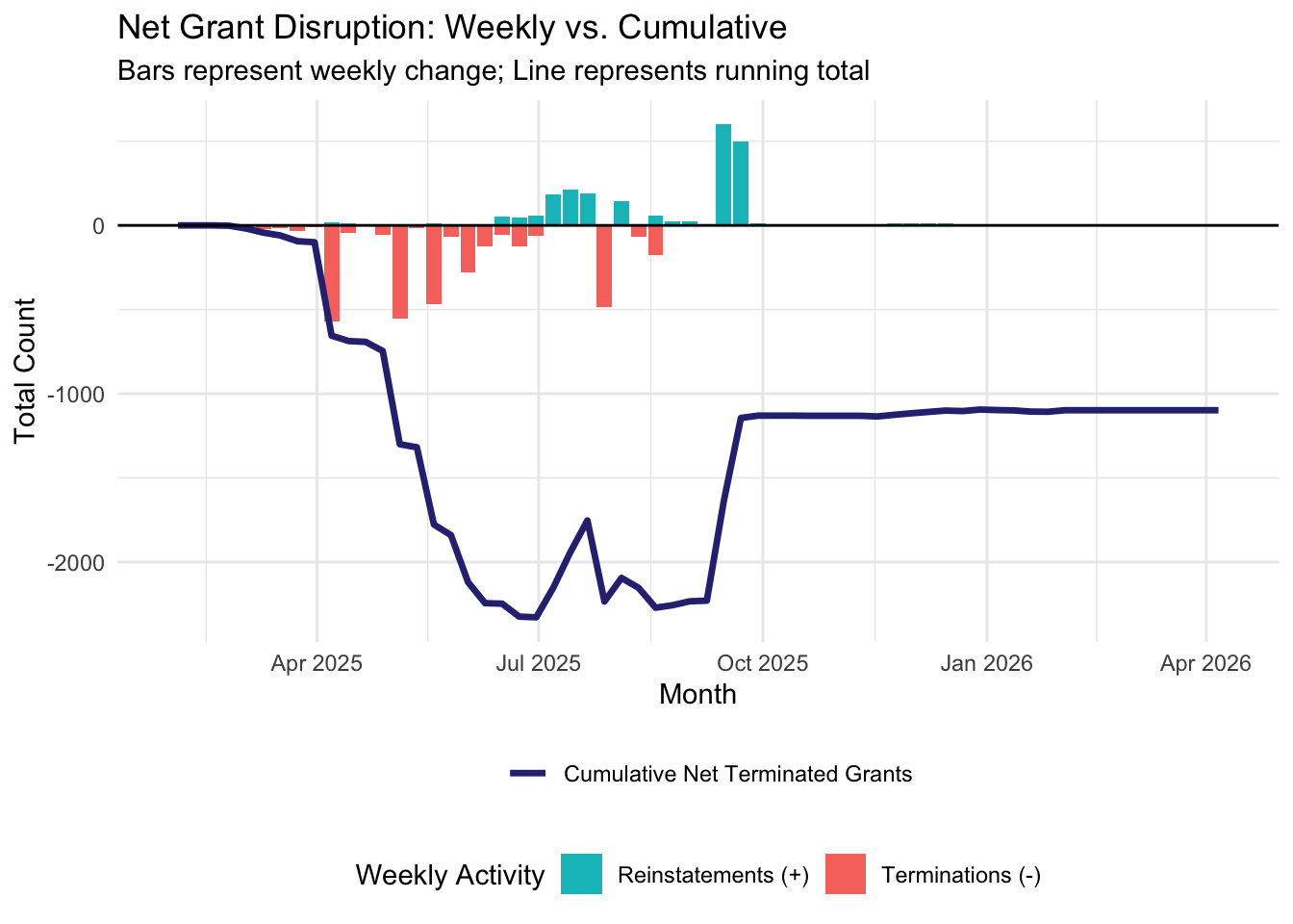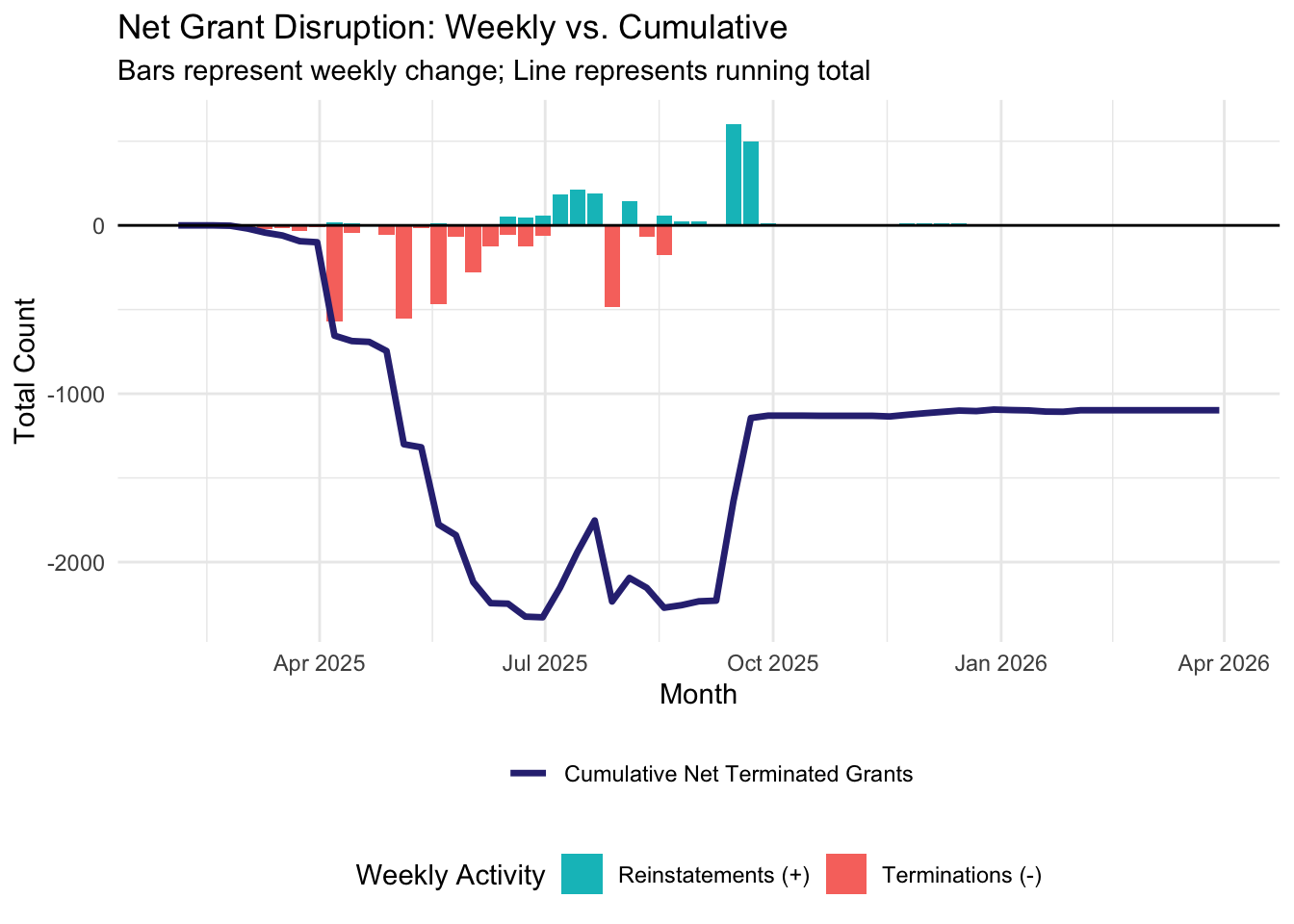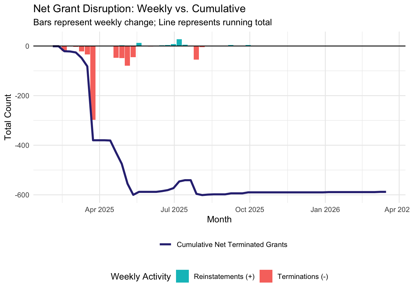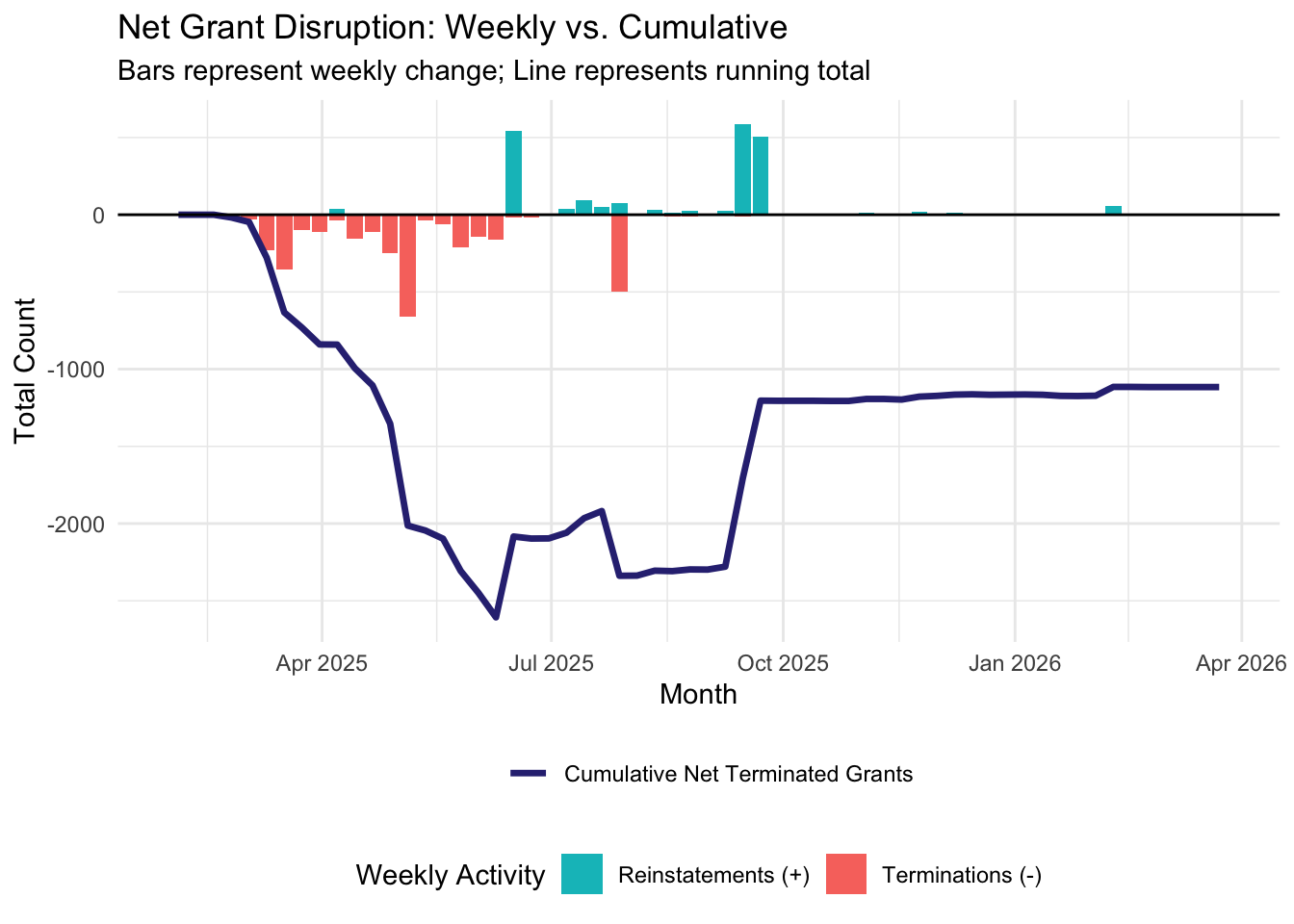 Starting the week of February 2nd, 2026, we will be publishing weekly reports that summarize and analyze the most recent grant disruptions, starting with a summary of what happened in 2025 and into the first month of 2026. If you would like to review a certain week’s report, navigate to the relevant post below.