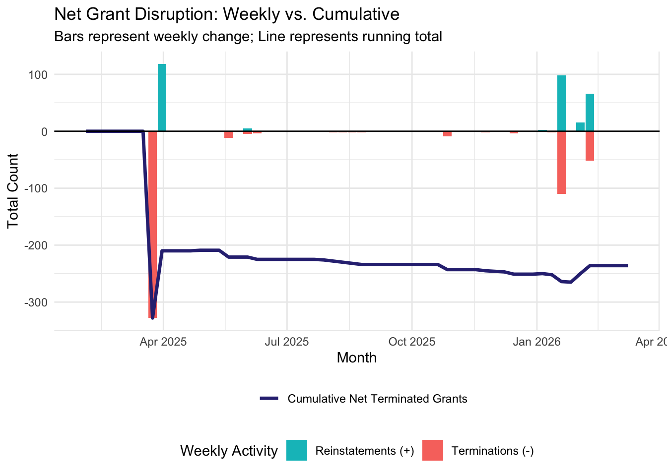 To calculate the weekly change in grant disruptions, we calculate the total number of reinstatements (+) for that week and subtract the total number of terminations (-) from it.