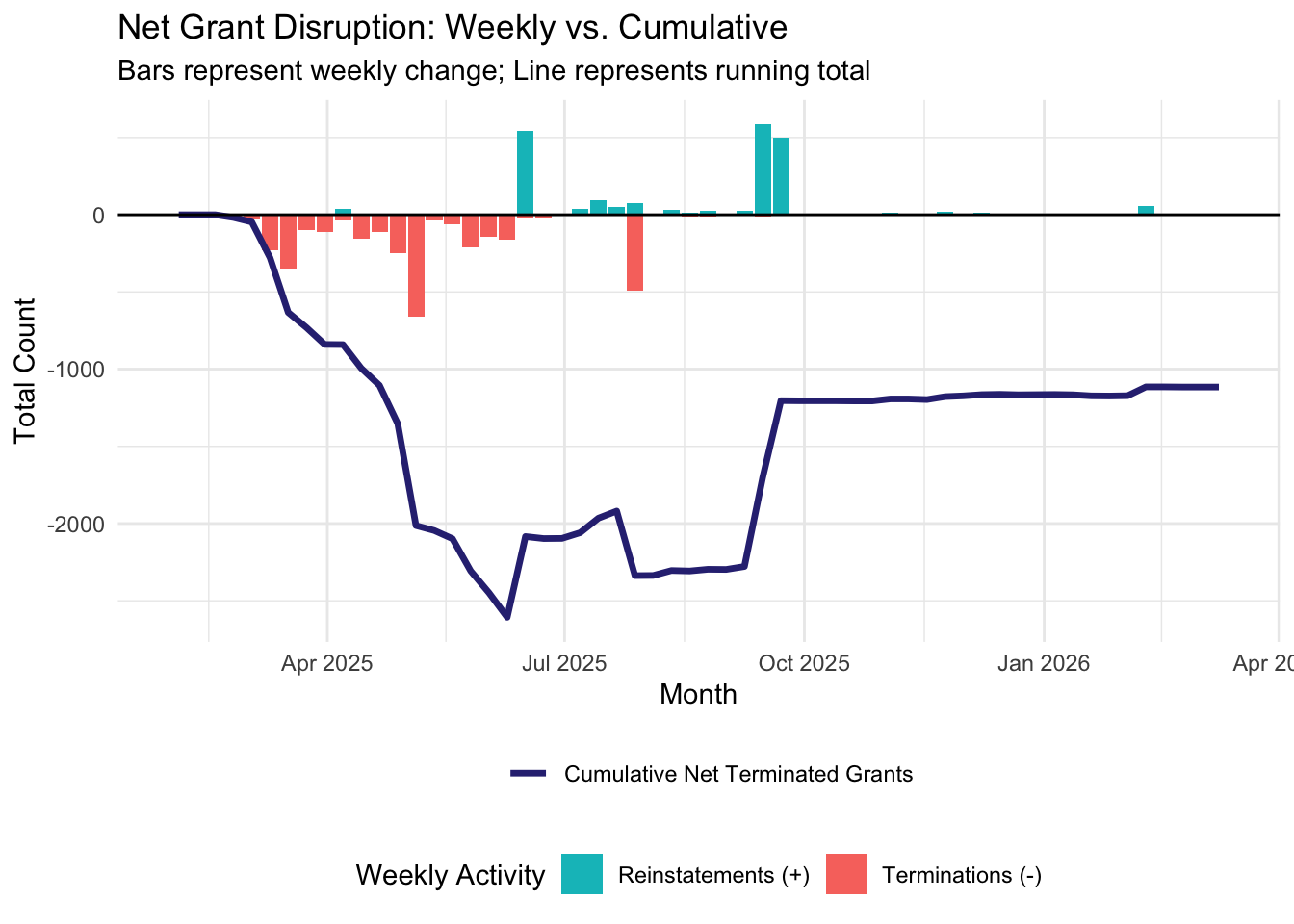To calculate the weekly change in grant disruptions, we calculate the total number of reinstatements (+) for that week and subtract the total number of terminations (-) from it.